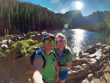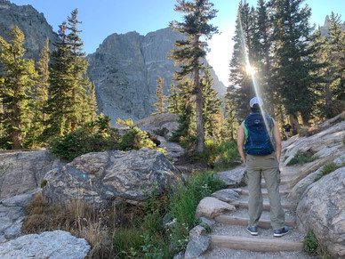Ready to stretch our legs, we made our way to the Bear Lake Trailhead for a hike to visit the infamous, magical lochs of the Rockies. Equipped with our masks, hiking packs, and sun glasses, we hit the trail. Tall conifers lined the rocky trail, layered with lush grass and shrubbery. The nymph lake, camouflaged by green lily pads, greeted us behind the shadow of the peaks. Small streams babbled past the trail. Beyond the opening of the Ponderosa pines, Dream Lake winked a coy greeting as the sunlight blinked across the undulating surface. Friendly chipmunks again searched our hands for a treat. Along the trail, tiny wildflowers painted the trail way, echoing the beauty of Mother Nature. We made it to our final location for the evening as the sun was setting behind Flattop Mountain. Emerald Lake, a deep verdant green, sat over 10,000 feet above sea level, as a true precious stone nestled between the rocky peaks. We rested at the lake for awhile, watching the water turn a deeper green as the light faded slowly. Peace among the mountains. Finally, we set off back to the trailhead and Ren.