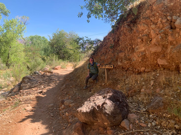We spent about 15 minutes at each break point (1.5 and 3 mile rest houses) filling our water bottles and stretching our legs. Deeper we hiked, passing fewer and fewer hikers as we made our way to Indian Garden. The trail grew more flat and narrow, cacti crowding our feet as we moved. I stopped occasionally to peer into the distance, searching for the place where we began our journey high above where our feet left footprints in the sand. The sun had finally found us, scorching our backs as we peeled off the layers that had once fended off the chill. We found shade at the campgrounds of Indian Garden. Tall green cottonwood trees with large leaves provided shelter from the sun's rays and a respite before the ascent back up. We spent half an hour exploring this heavenly place, lathering on a layer of sunscreen, draining our water bottles, and munching on carb heavy snacks to replenish our stores.